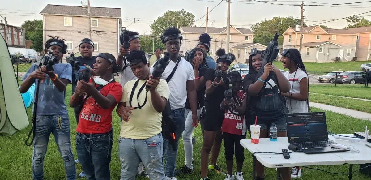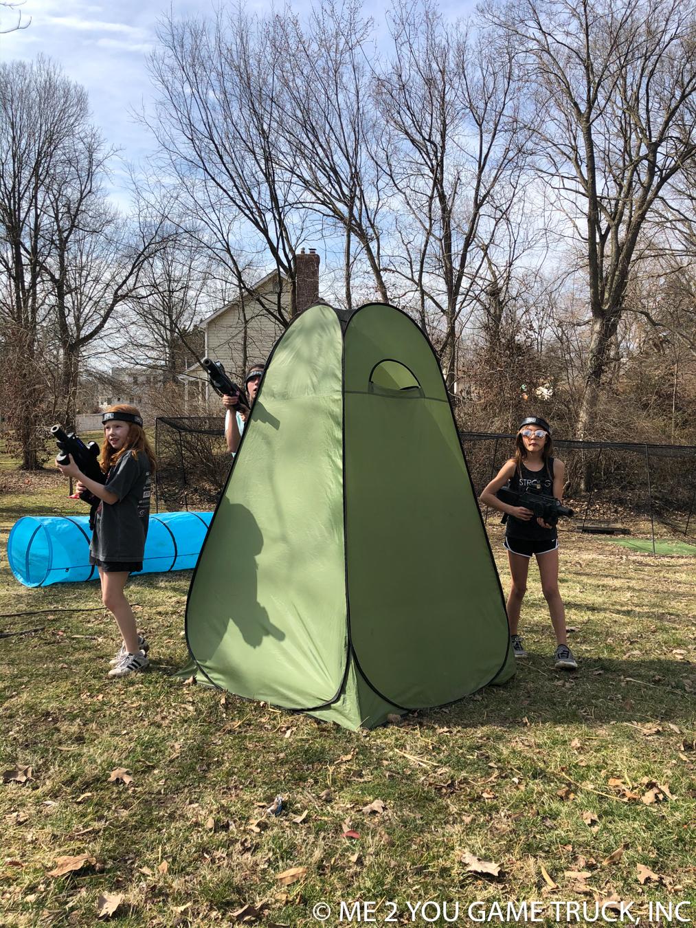 ABSOLUTELY! Often folks think of indoor, black-lighting, laser tag. Our laser tag system works using and IR signal (think of pointing your TV remote at the TV.). So, we can play indoor or outdoor and have an amazing time. Our systems can shoot up to 600' so a typical backyard is not a problem.